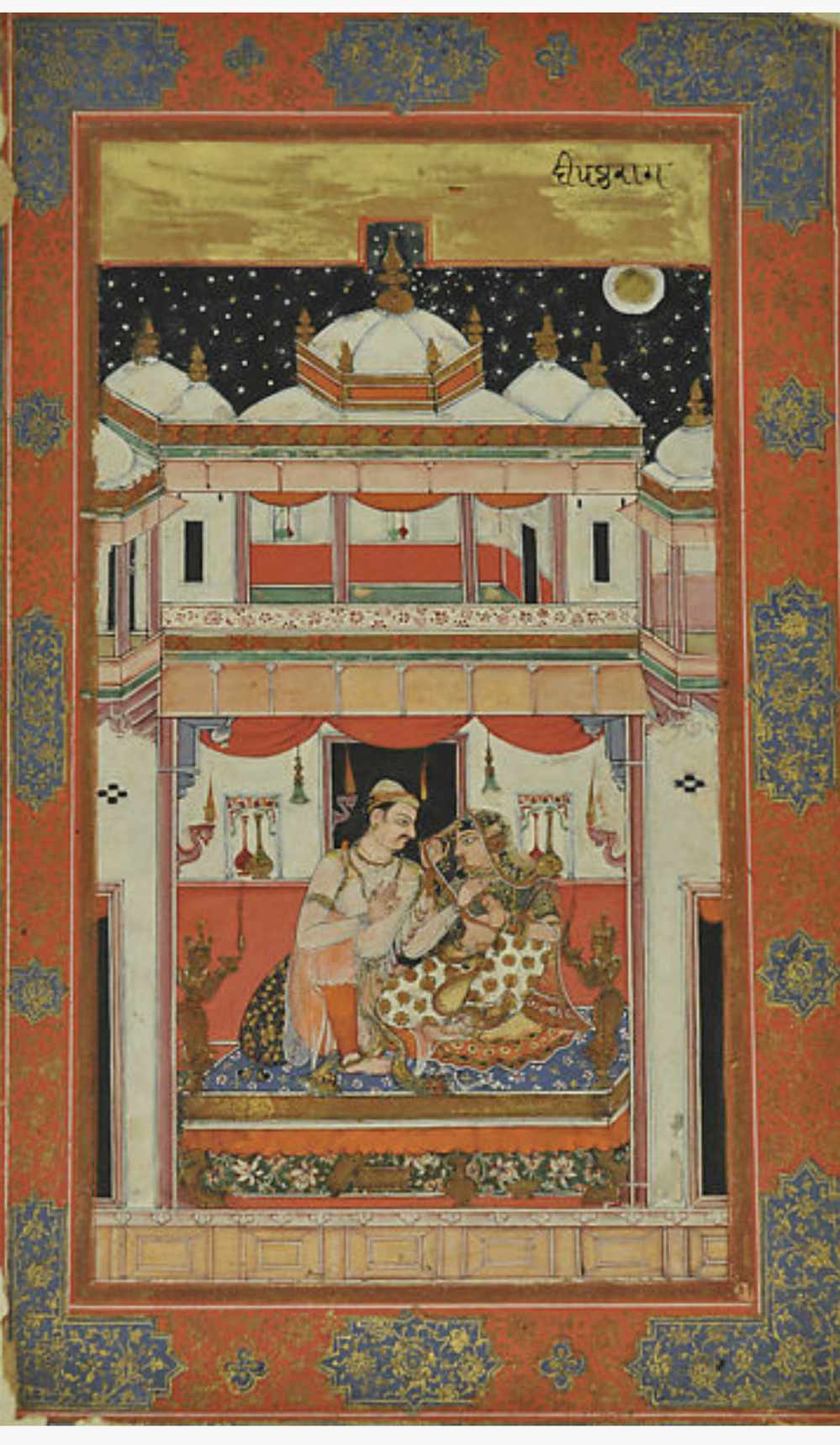 This folio depicts raga Deepak in a plush palace- the scene is set at night, with stars in the sky, and stylised lamps with long flames! The mood is romantic and the picture is incandescent!