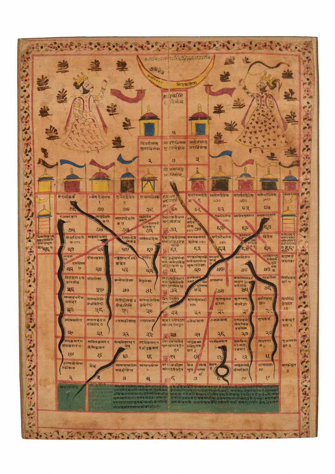 Games are never only for fun, and snakes and ladders were opportunities to teach a child (or a grown-up) lessons of morality, values, and religious ideas. The boards also came in various forms and figures, but the basic premise was consistent-- climb up a ladder on good deeds (or a lucky throw of dice), and slither down when a snake bites. As art historian BN Goswamy points out, a Jain snakes and ladders will not be the same as a Vaishnava board.